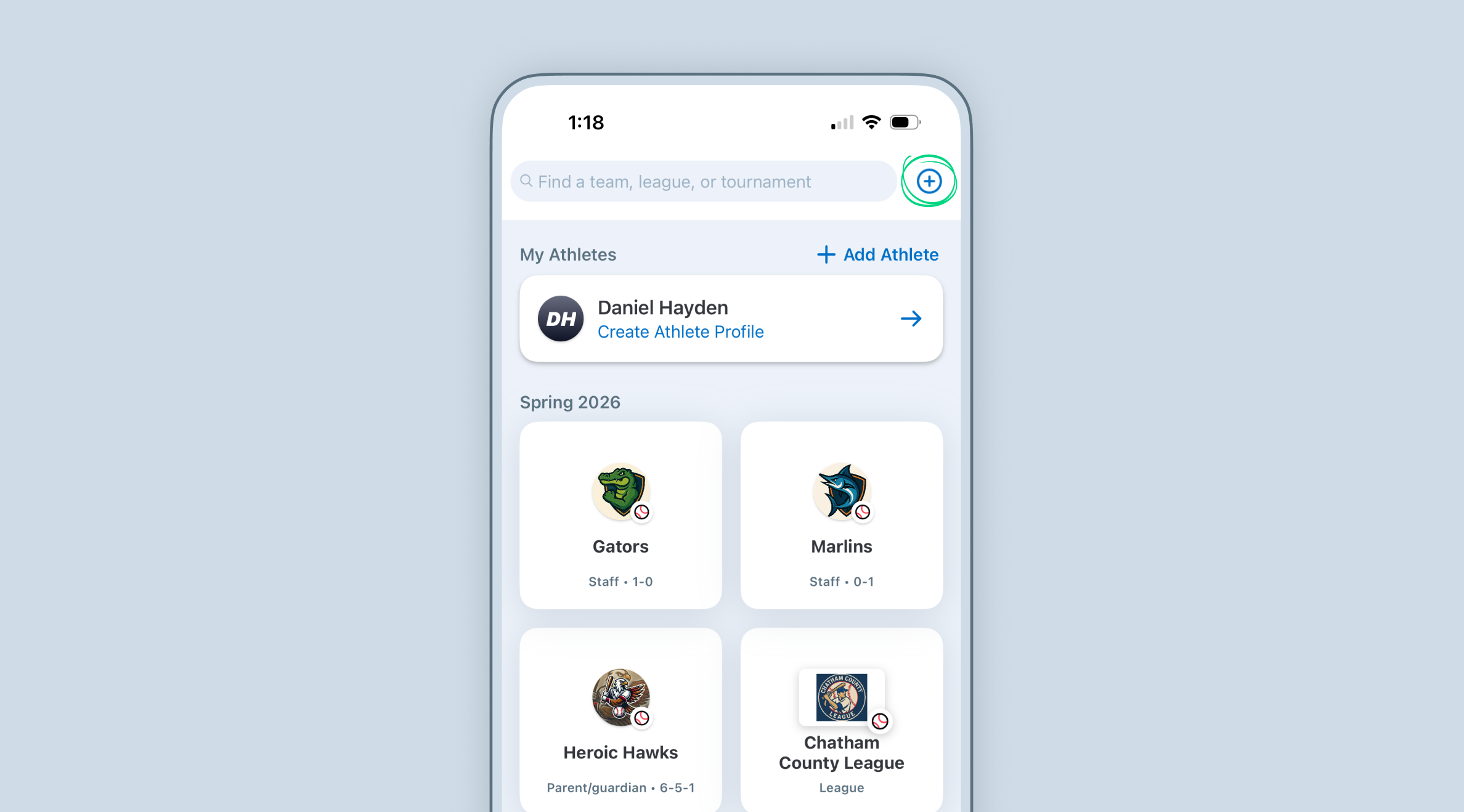 - Tap the "+" icon in the top right corner. From there, you will be able to create your team.