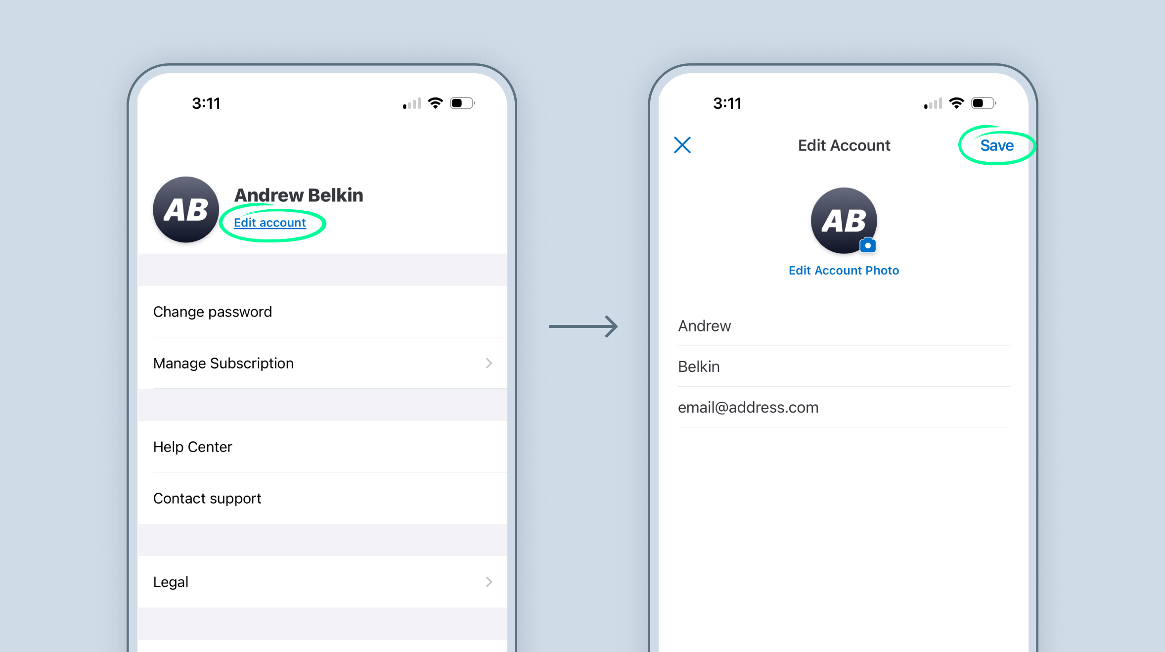 - From there you can edit your name, email, and account picture. You will not be able to change your account's email address to an email that is already in use in the app or has been invited to the app.
