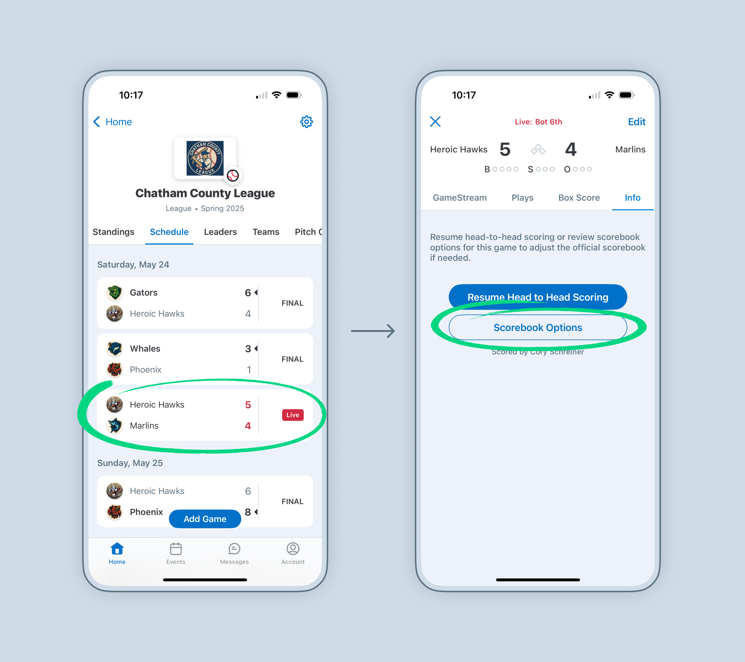 Have a game stuck in LIVE but know a scorekeeper scored the whole game? How about a game in which you prefer one scorebook over another? No problem! As a baseball or softball league or tournament admin, you can review all of the scorebooks from your Head-to-Head games and make any necessary adjustments in-app.
