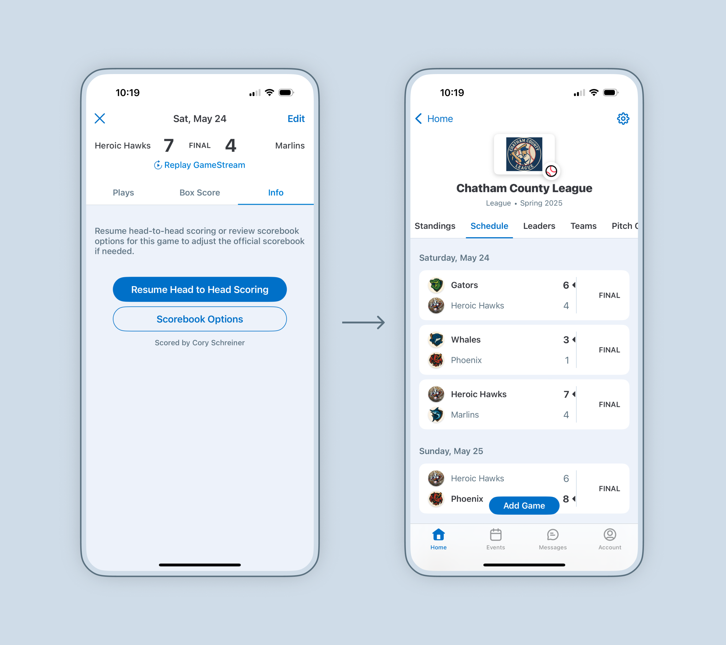Once you confirm your selection, your league/tournament schedule and stats will update based on your preferred scorebook.