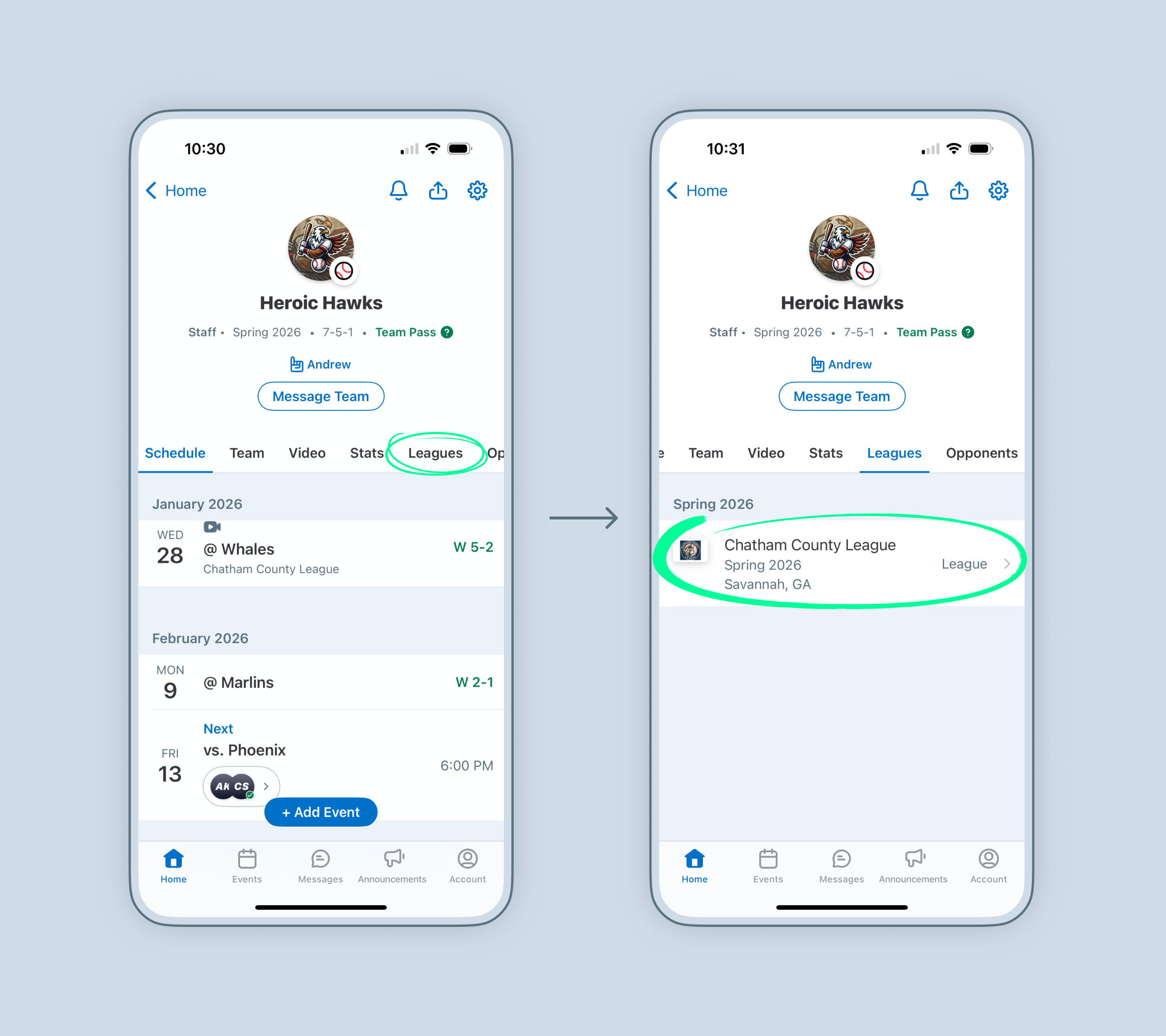 If you are following a team on your account that is in a League, Tournament, or Travel Organization, you can also access from the team page.