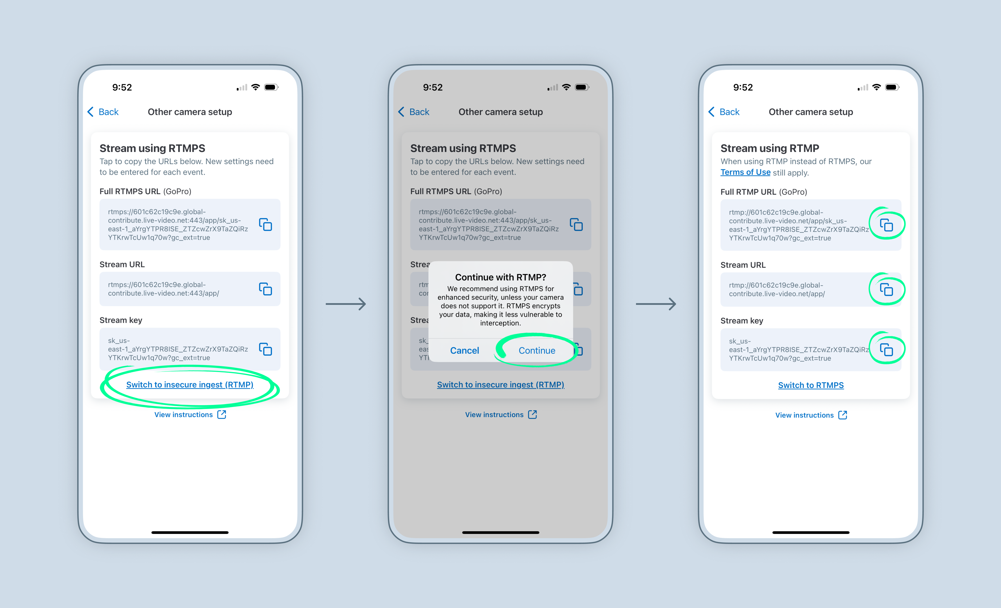 Scroll to the bottom of the page and tap Switch To Insecure Ingest (RTMP).