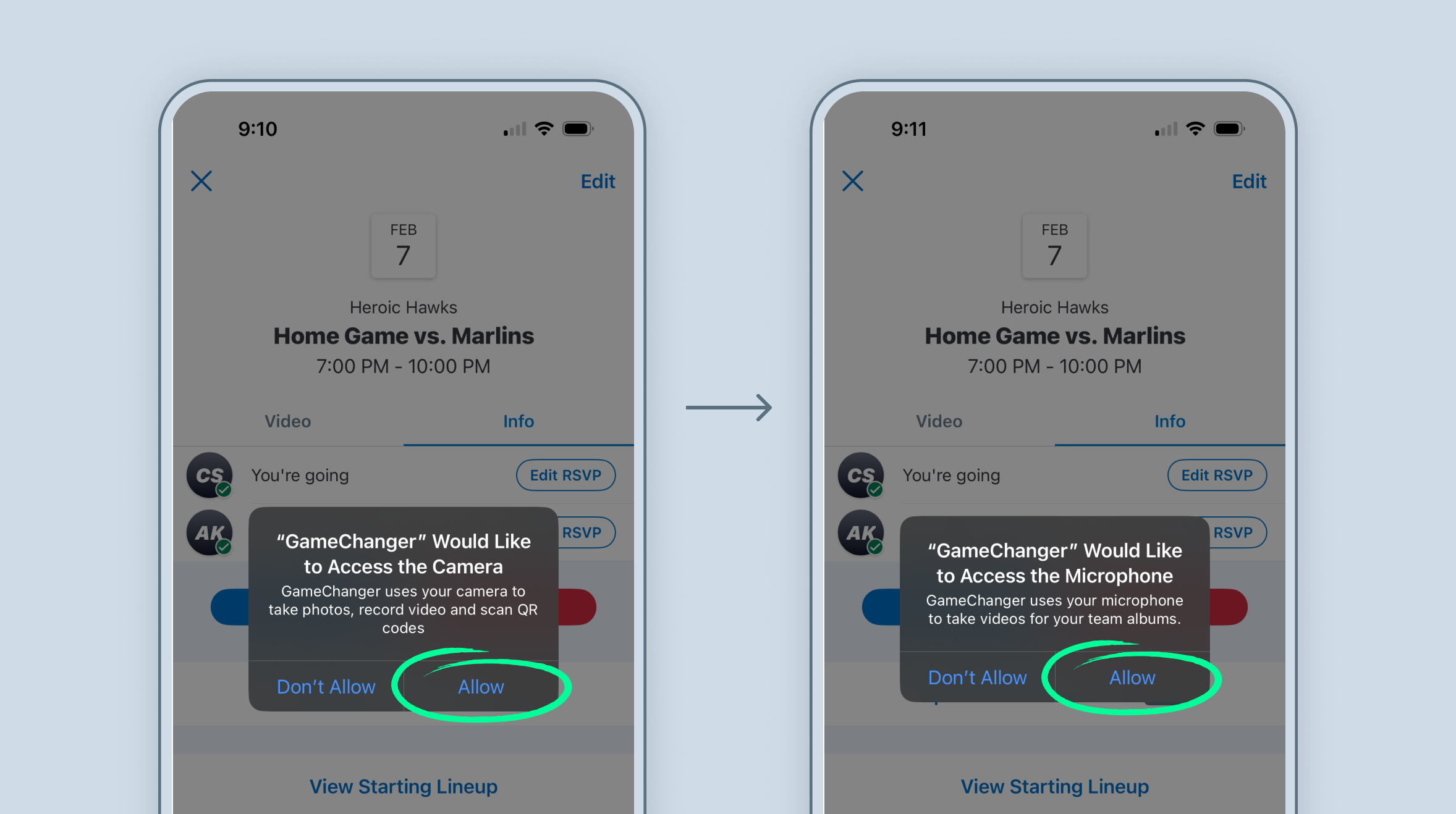 If you haven't previously used the feature, grant GameChanger permission to use your device’s camera and microphone.