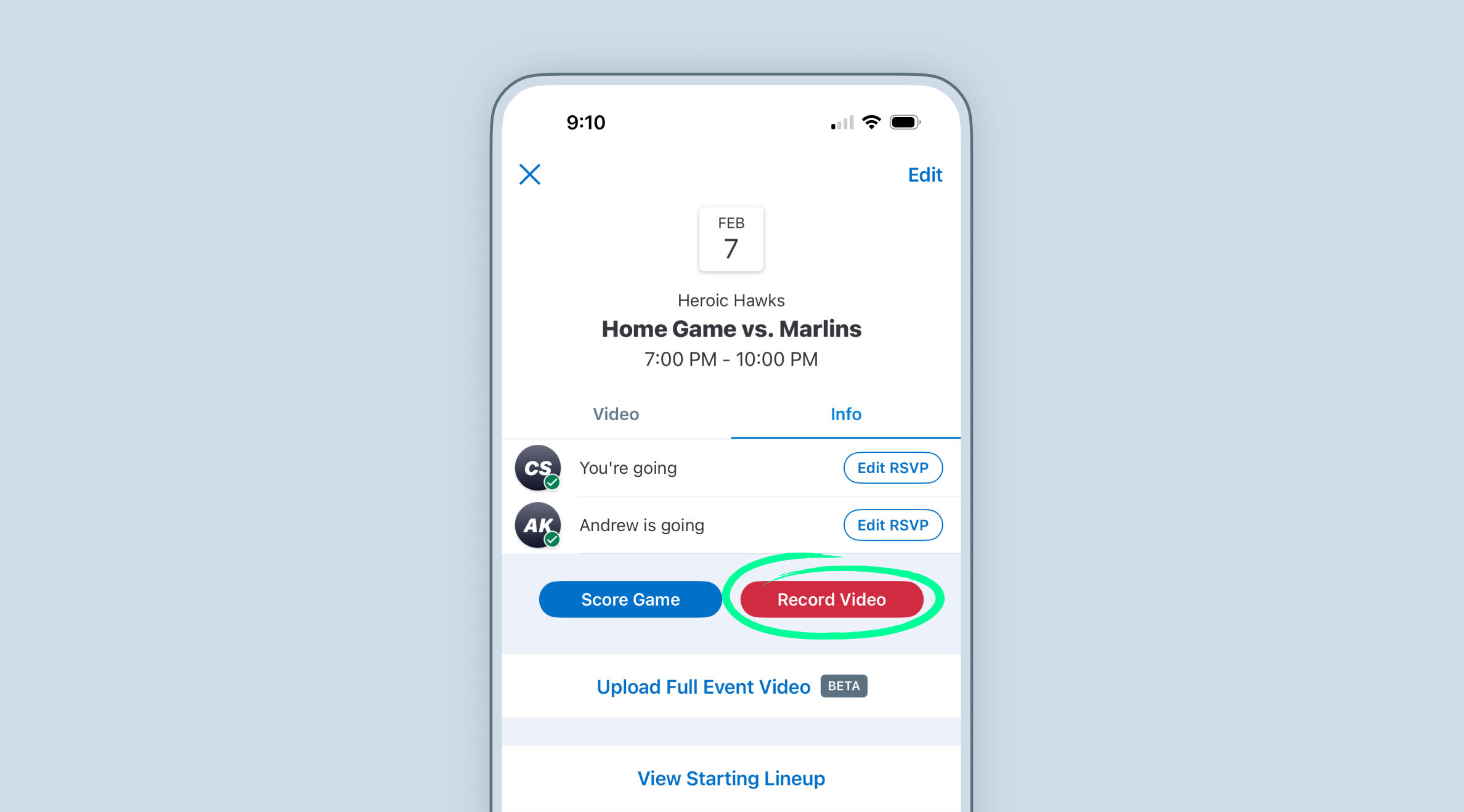 Any team Staff member or account granted streaming permissions can start live streaming and recording video of their team's games in GameChanger with just a few taps.