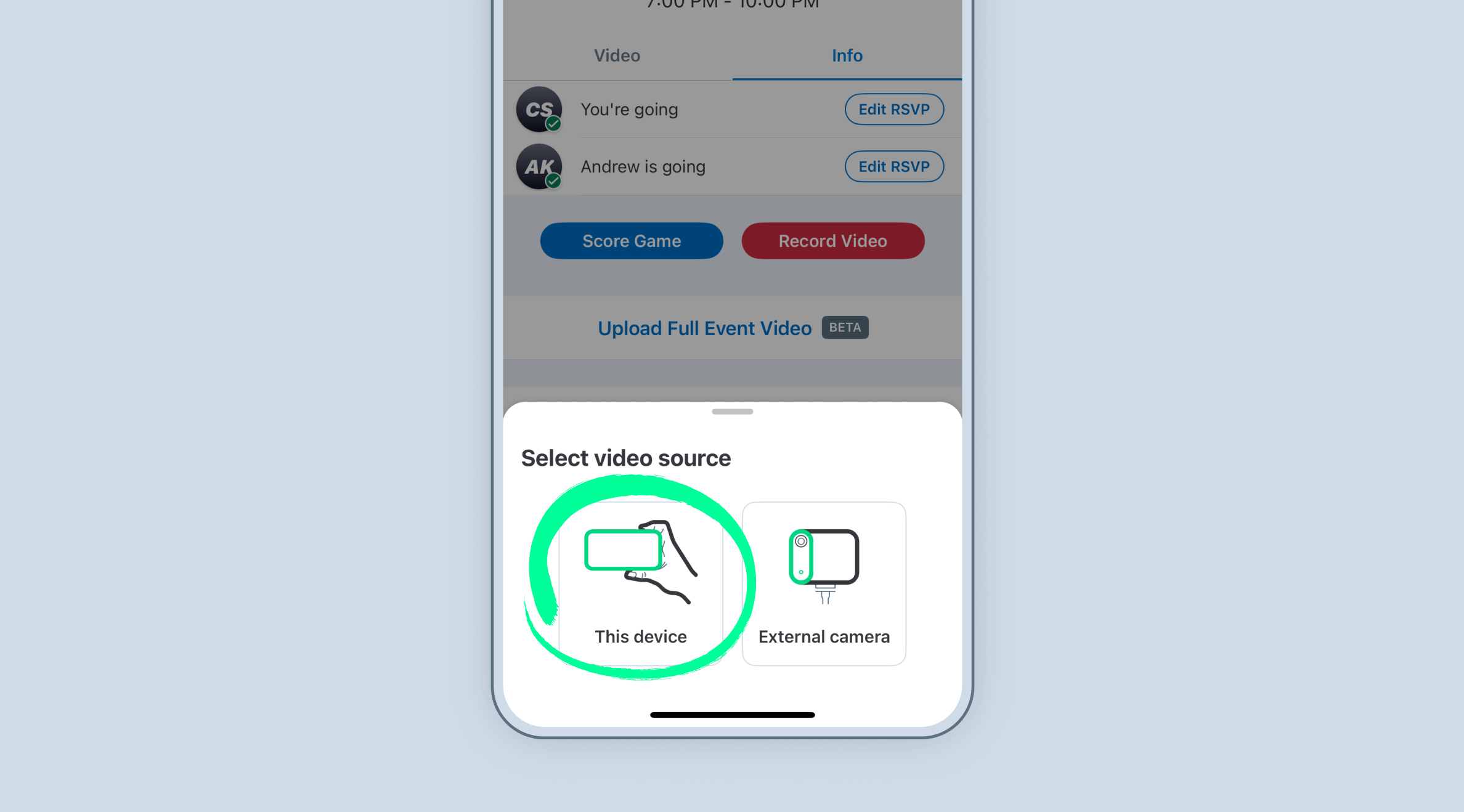 - Record* to device only - The user can record video directly to their device from the GameChanger app. Record video when you have little to no internet connection. Recorded videos can be uploaded after using our Upload Full Event Video feature.