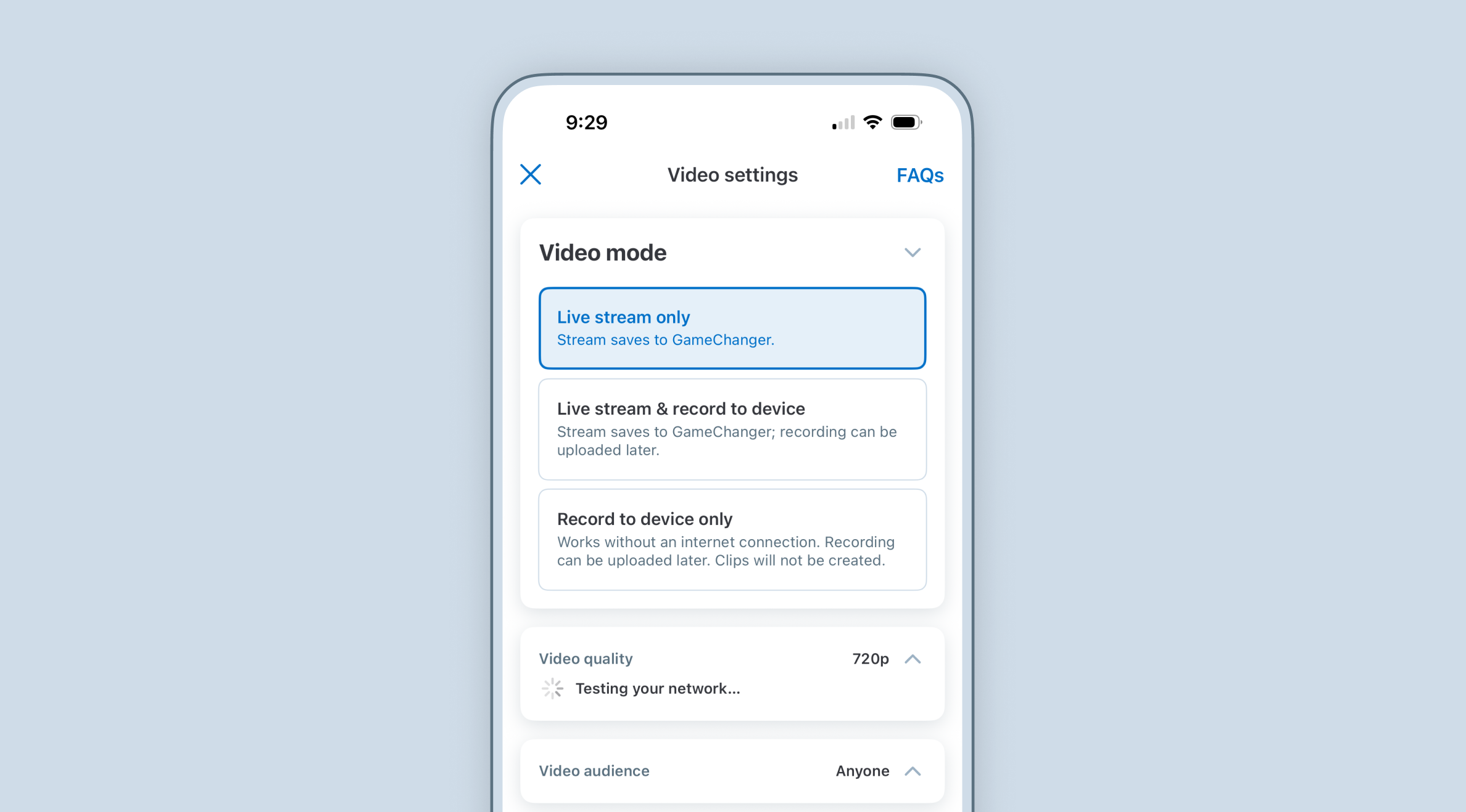 - Choose your desired Video mode: Live Stream, Live Stream and record to device, or Record to device only.
