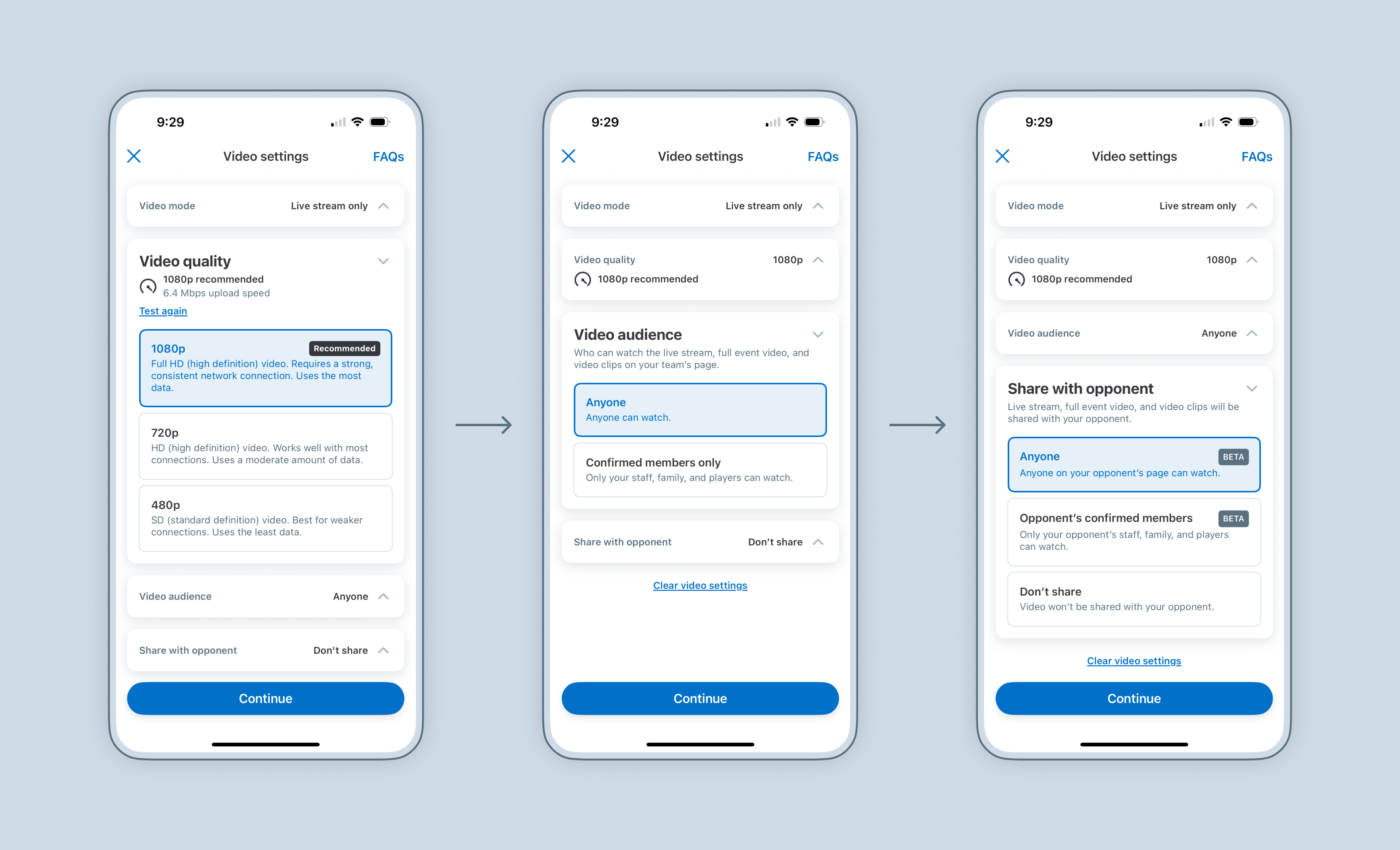 Choose your video quality, pan & zoom mode, audience, and sharing permissions, then tap Continue. These selections will be saved for your next stream.