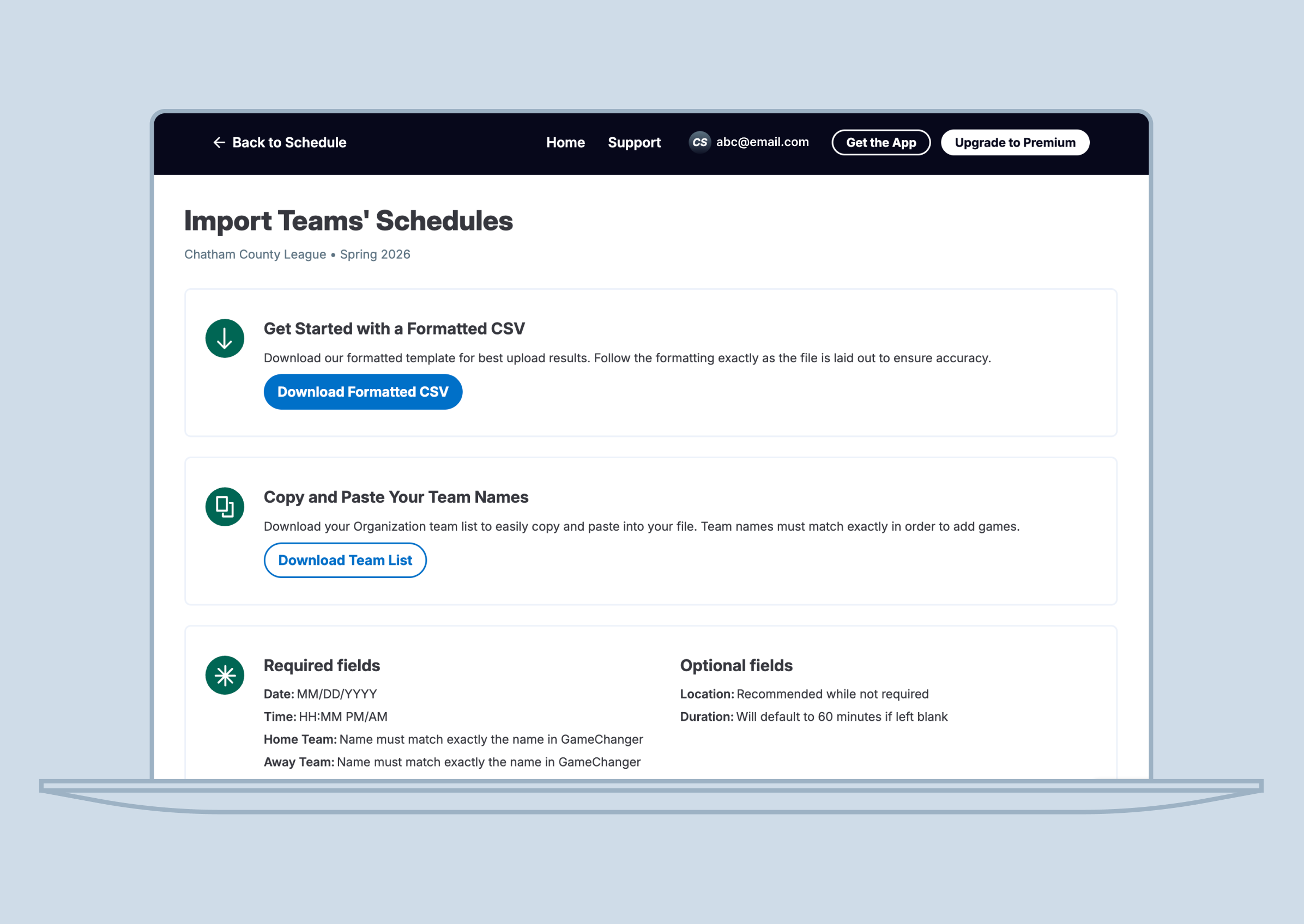 - Select the Download Formatted CSV button to get a formatted .CSV file to get started. You can also use the Download Team List button to get your Organization's custom team list.