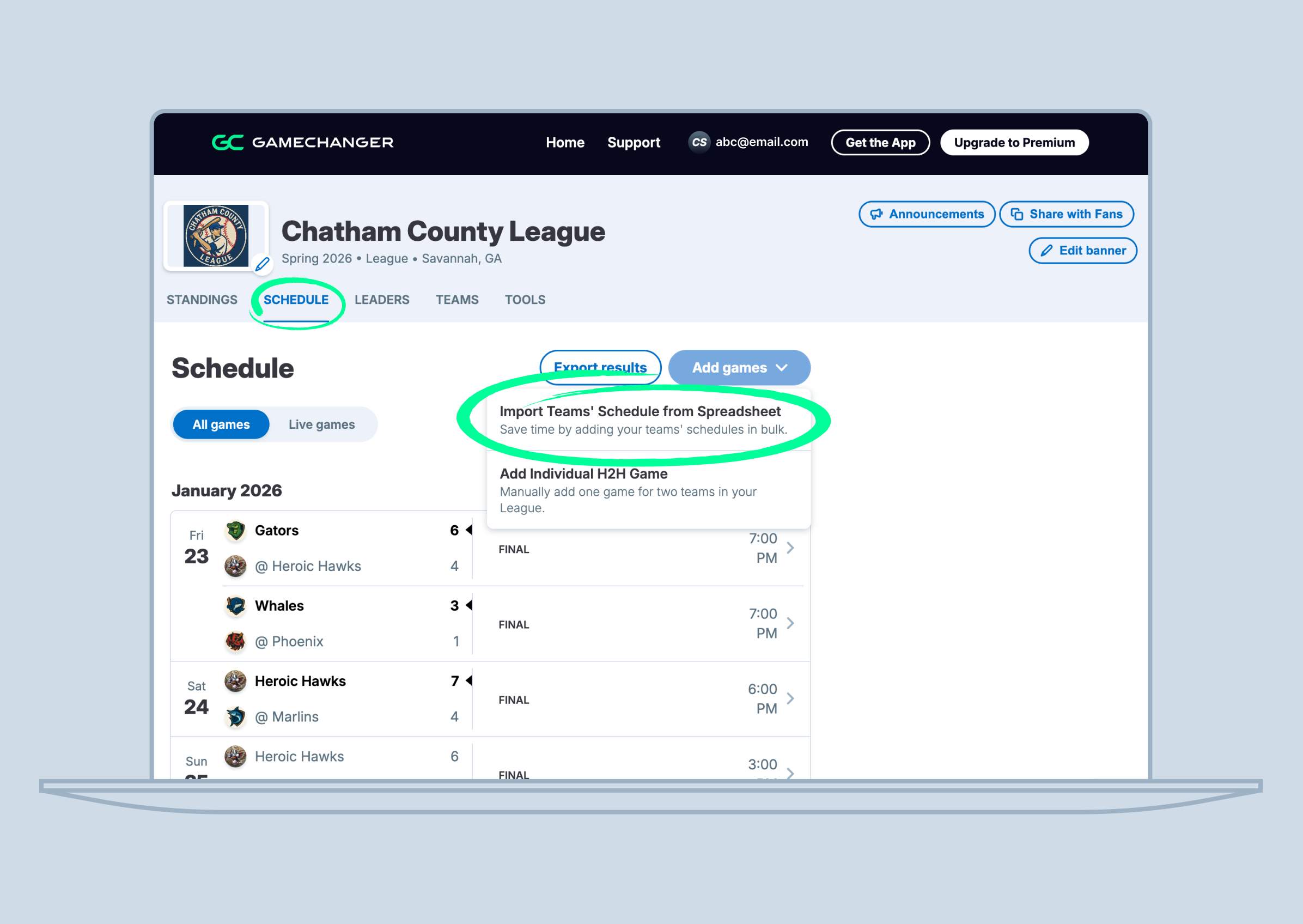 - From the Organization schedule page select the Add Games dropdown and select Import Teams' Schedule from Spreadsheet: