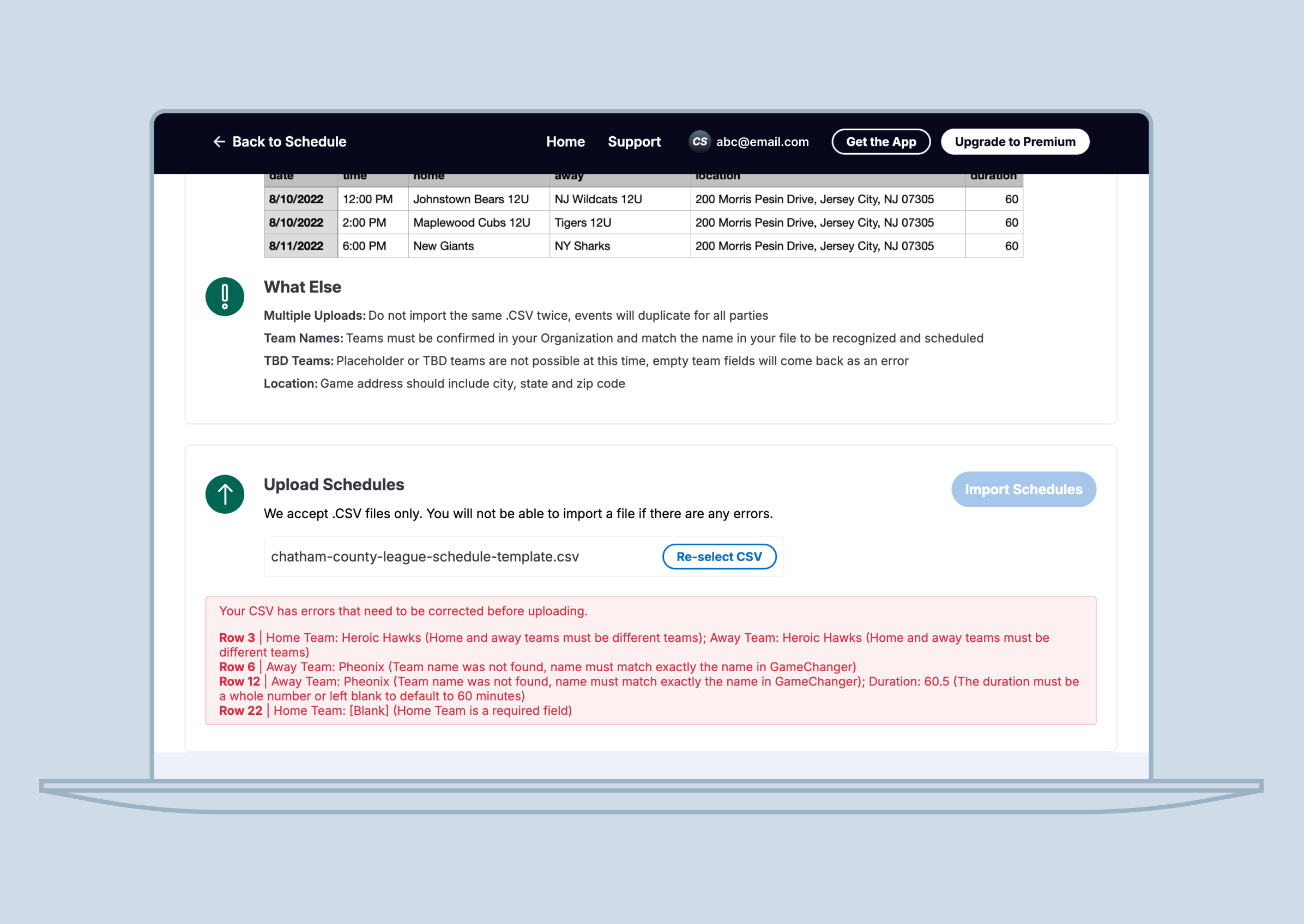 If you need to add many games simultaneously, you may want to upload a .CSV schedule on the web. The Bulk Schedule Import tool can be accessed by any Organization Admin on the Organization's schedule tab on the web.