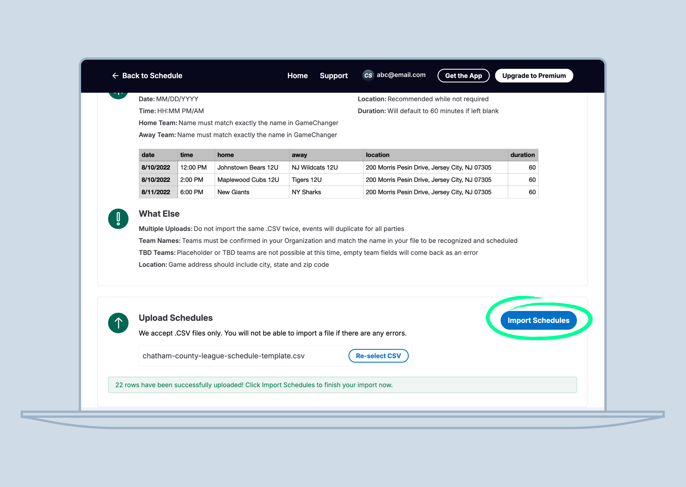 2. The ability to edit the .CSV template to upload into the GameChanger site