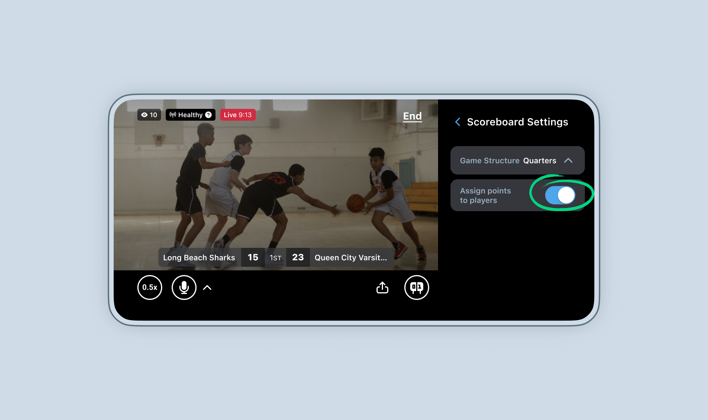 While streaming and scoring, users can assign points to specific players on their team, automatically creating highlight clips for those players.