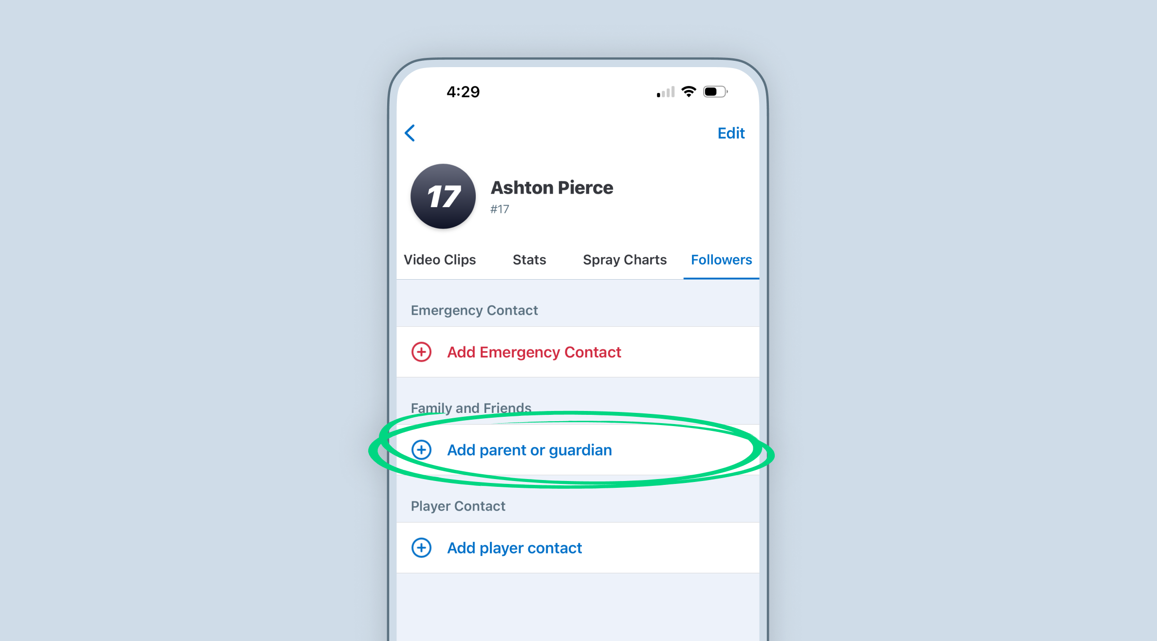 Team Staff members and existing Family contacts can invite family contacts of a Player in the app. Parents or guardian members can RSVP on behalf of a player, access team messages, view videos, and access stats content available to confirmed team members only. Some features are subject to subscription-level access.