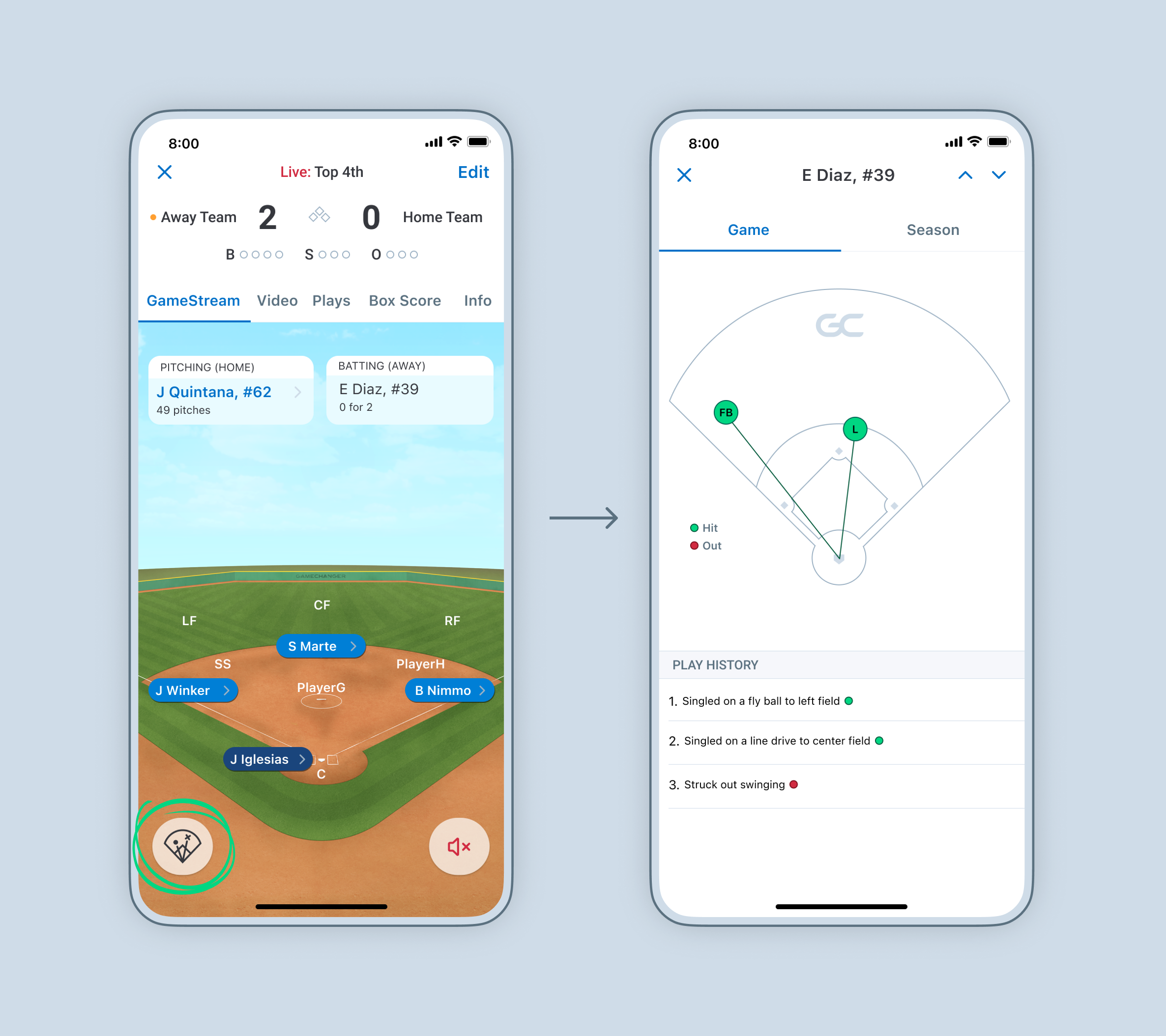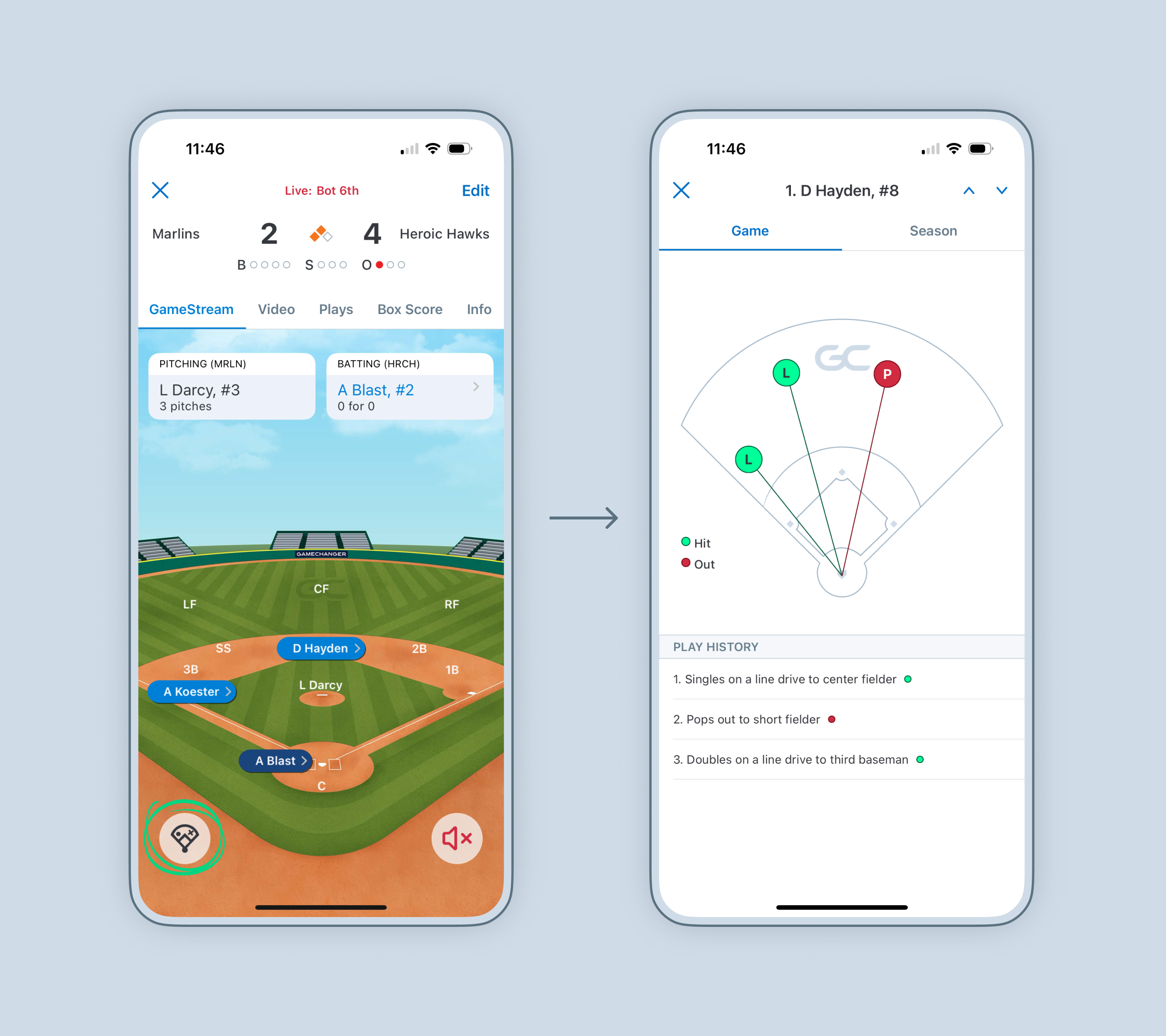To view the GameStream for teams you do not follow, search for the team in the app's team search, select Schedule, and select a live game to start watching.