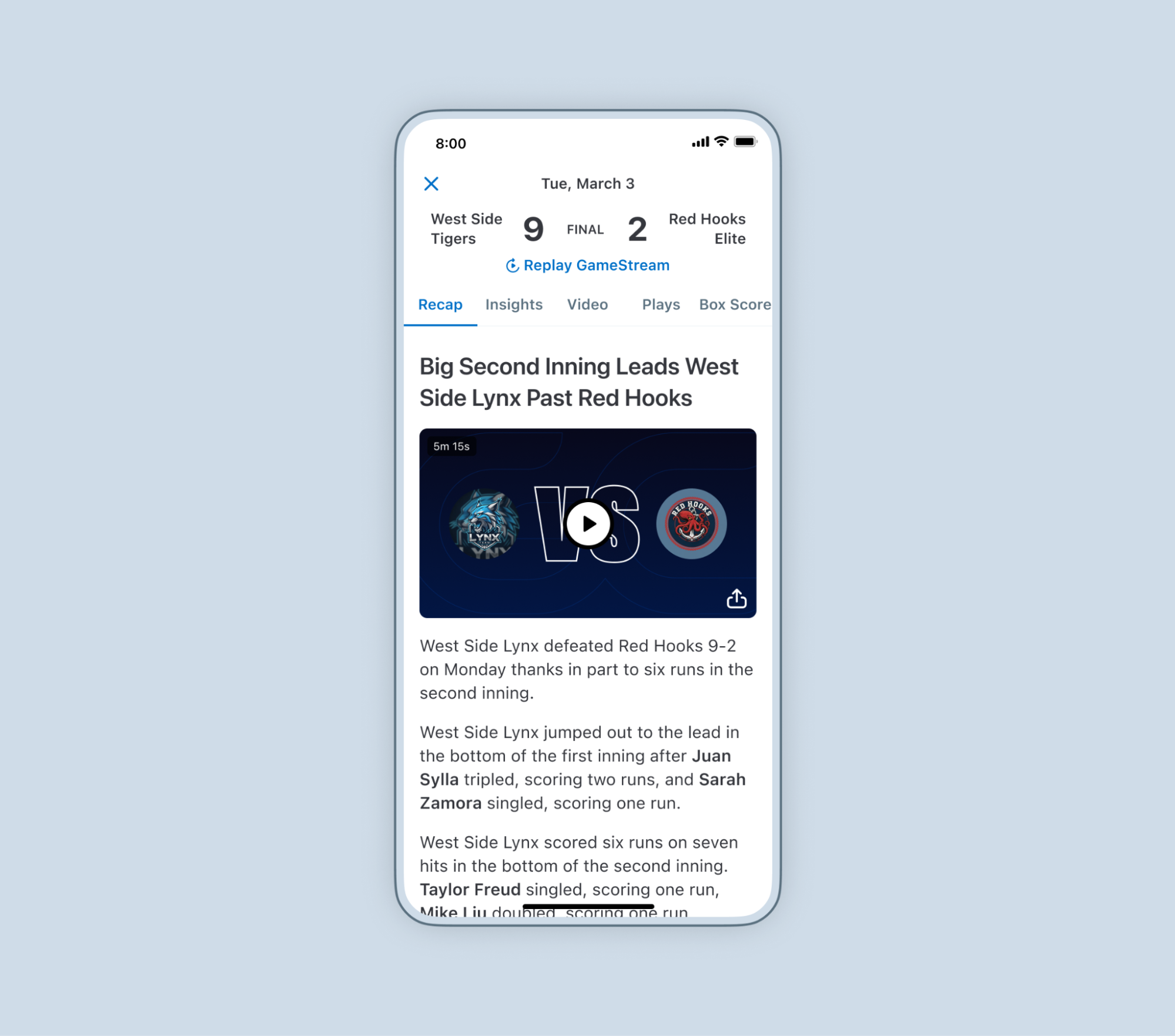 Look back, celebrate, and share meaningful moments with auto-generated highlight reels, game recaps, team and player stats, and individual Athlete Profiles.