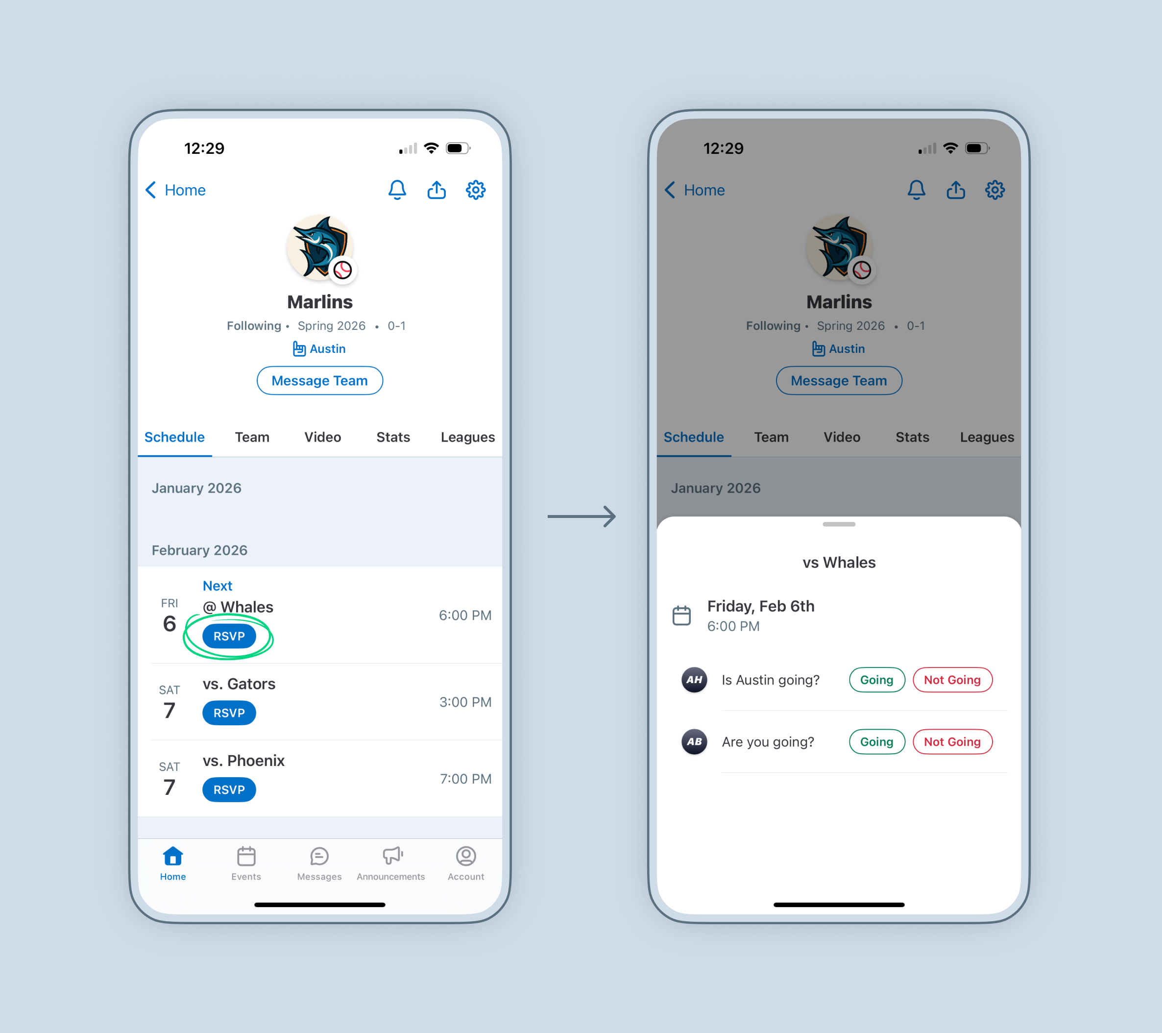 Track attendance and plan practices and lineups easier with streamlined event RSVP options. Family and athletes can now RSVP to multiple events from the overall schedule view, without having to tap into each event individually.