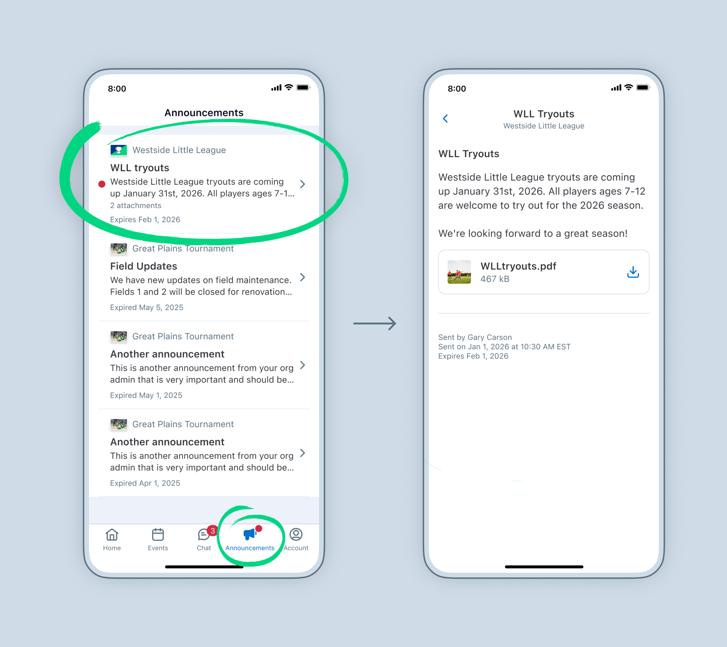 GameChanger now offers an announcements feature within Organizations! Organization announcements allow Admins to send important updates to tournament Admins, team Staff, and team's parents, guardians and players in GameChanger. This allows Admins to send communications to all teams in the Organization with one convenient location.