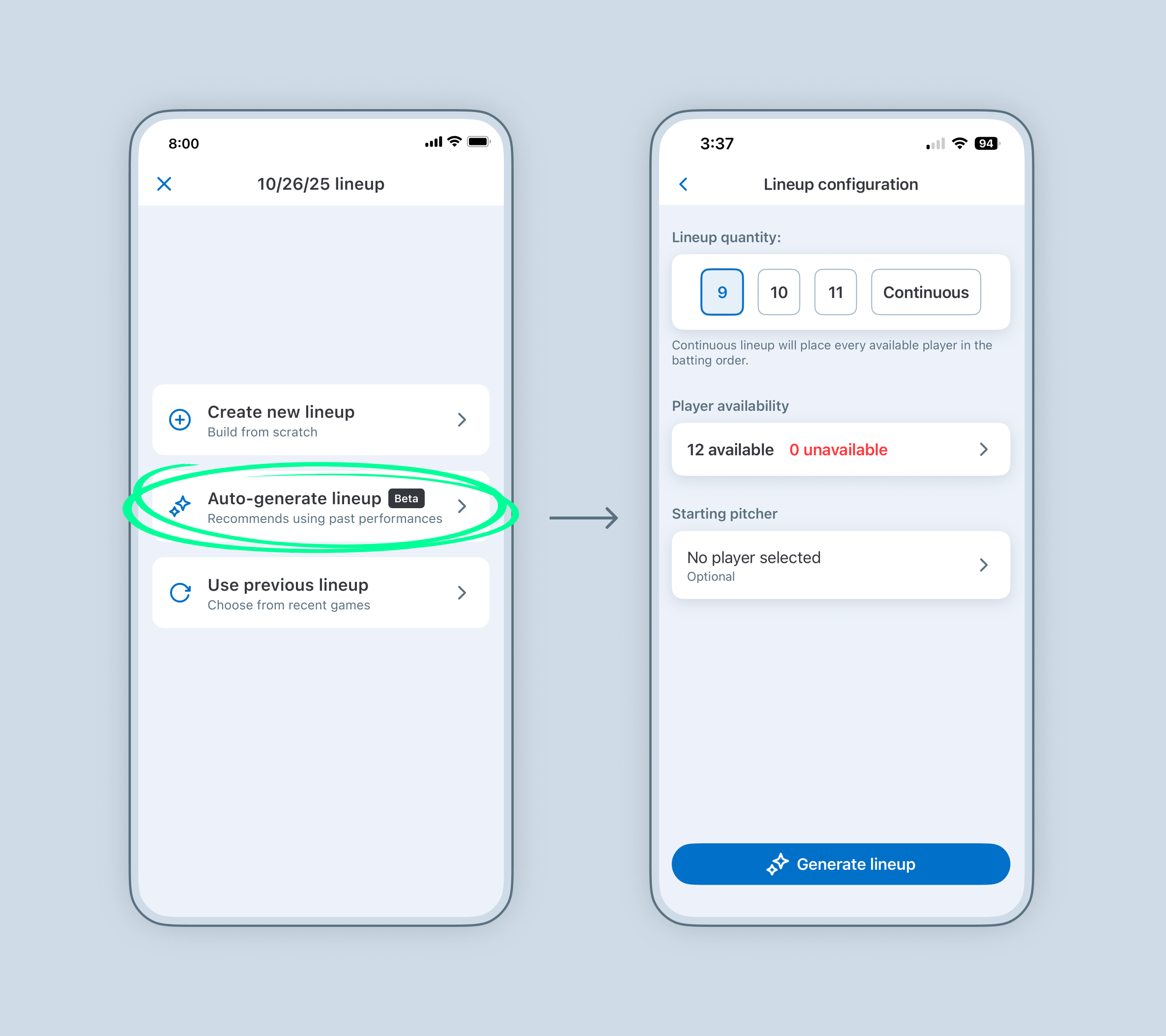 Available on web.gc.com, baseball and softball staff members can generate an optimized lineup by selecting Generate Best Lineup. These recommendations use GameChanger performance data and sabermetric principles to suggest batting orders and defensive positions designed to maximize team performance.