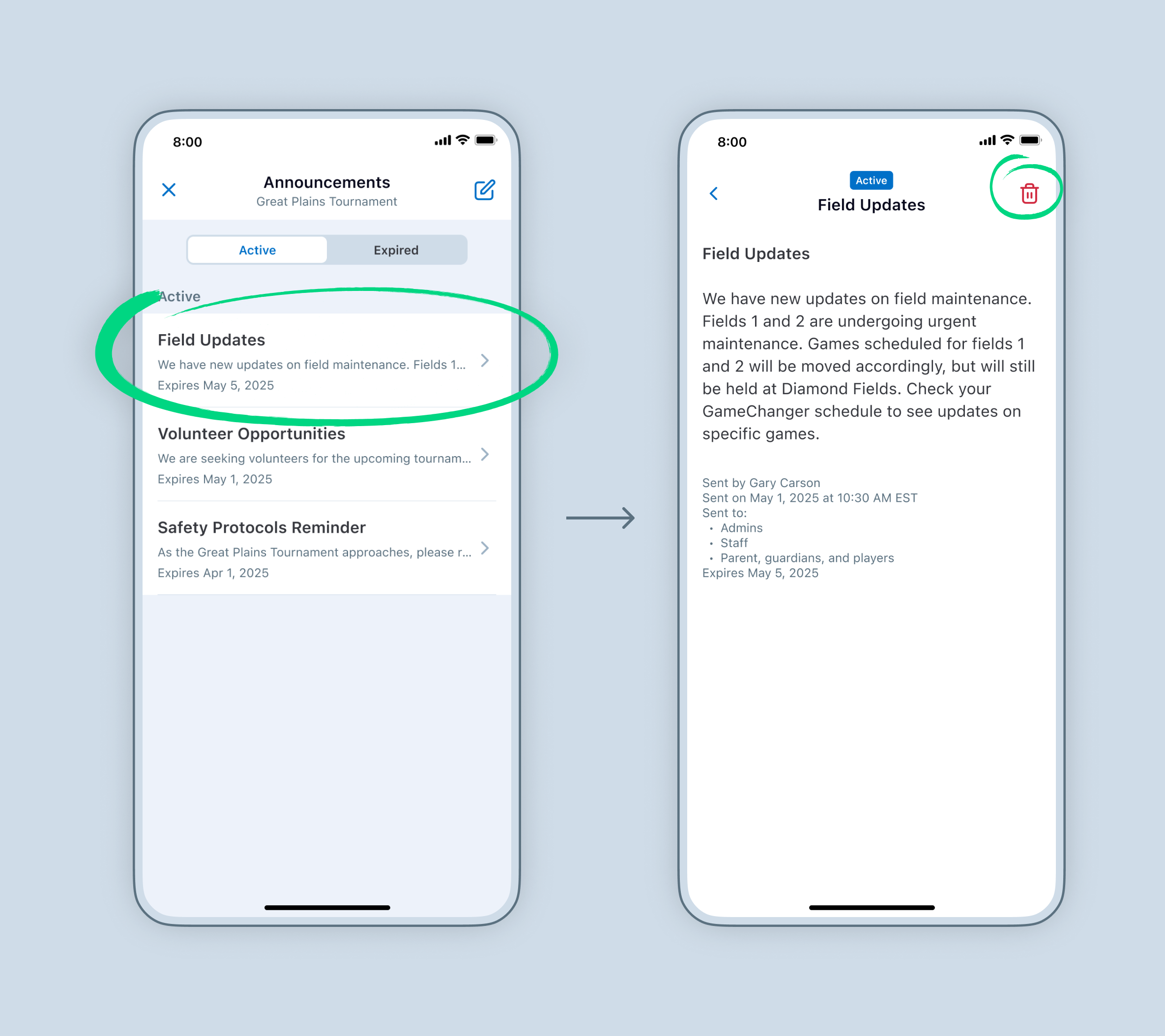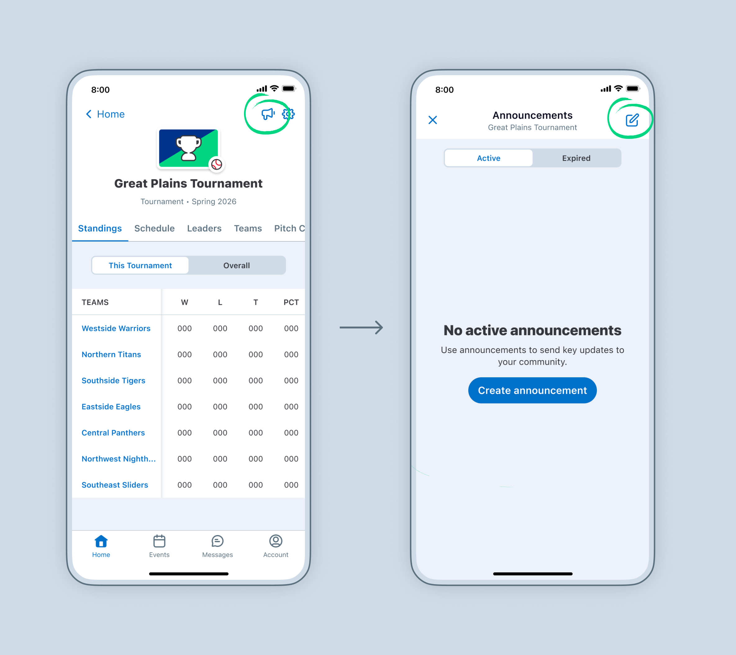 Organization announcements allow Admins to send important updates to tournament Admins, team Staff, and team's confirmed community members in GameChanger. These messages are sent directly from the Organization, reaching all members of the selected audiences.