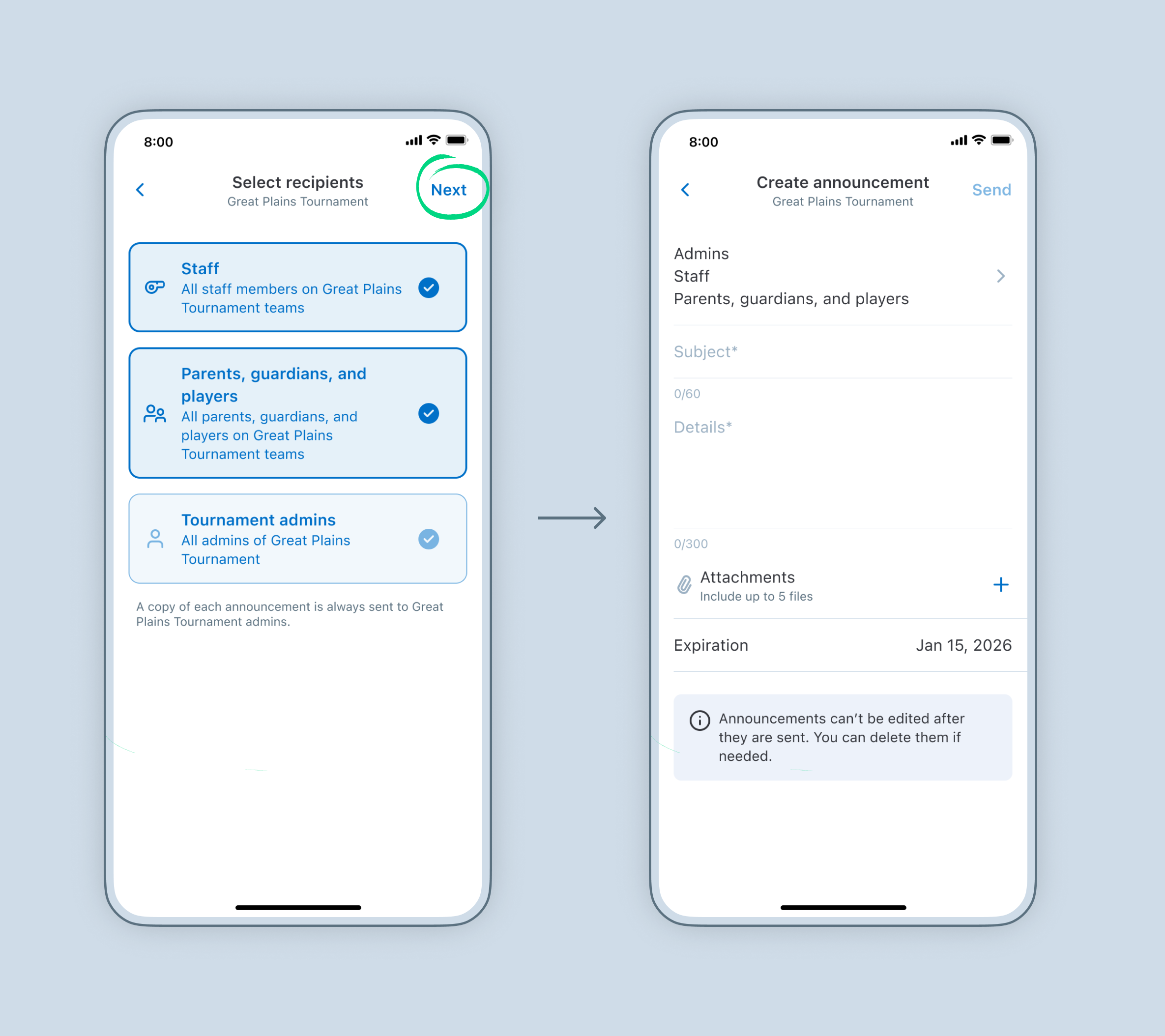 - Select the audience for your announcement. Other tournament Admins are always included in the audience selection. You can also choose to include Staff and/or Parents, guardians, and players in your announcement.