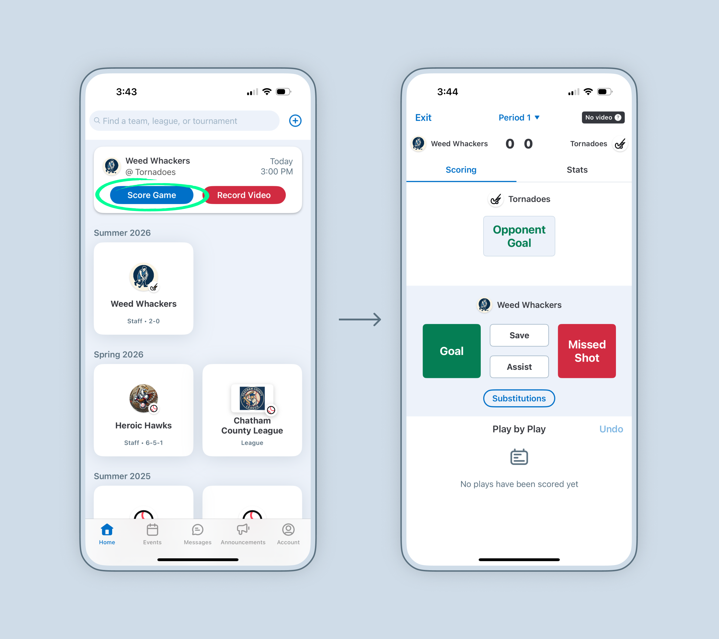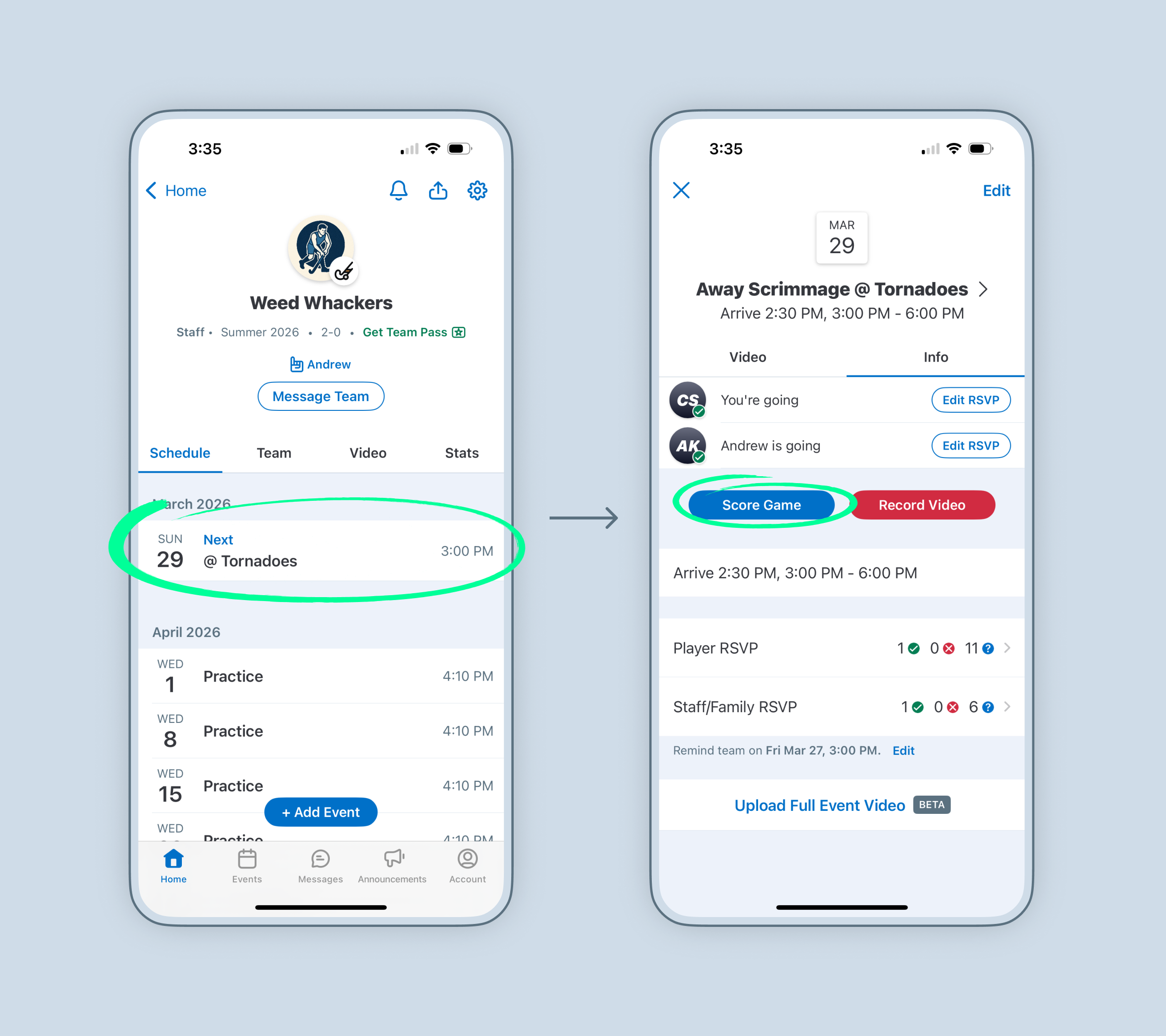 To score a game, select the event and then tap Score Game. You can do so from the team's schedule.