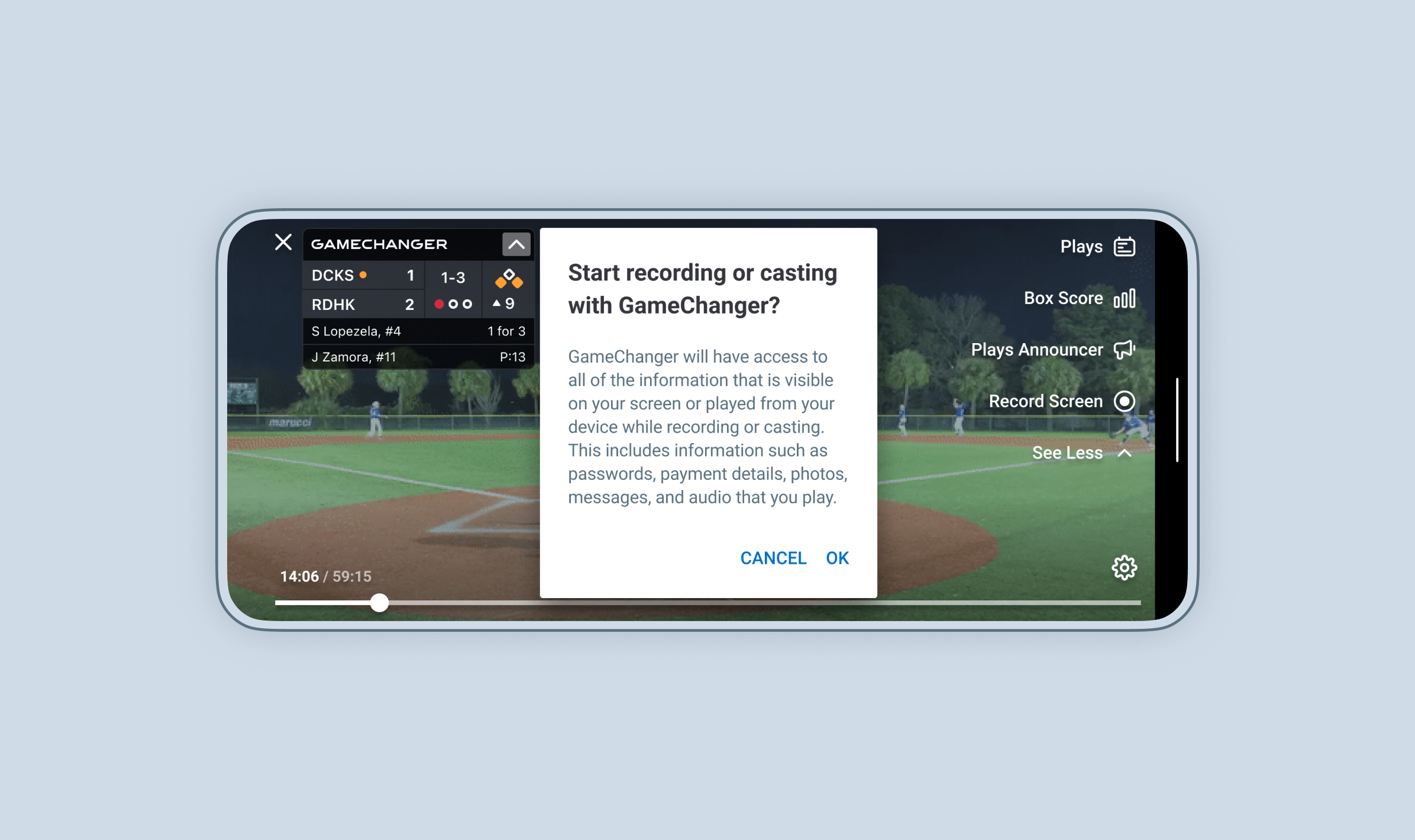 Screen recording through GameChanger is very similar to screen recording with Apple's built-in functionality. We have taken that functionality and put it in a more accessible place for our users to easily capture their favorite plays.