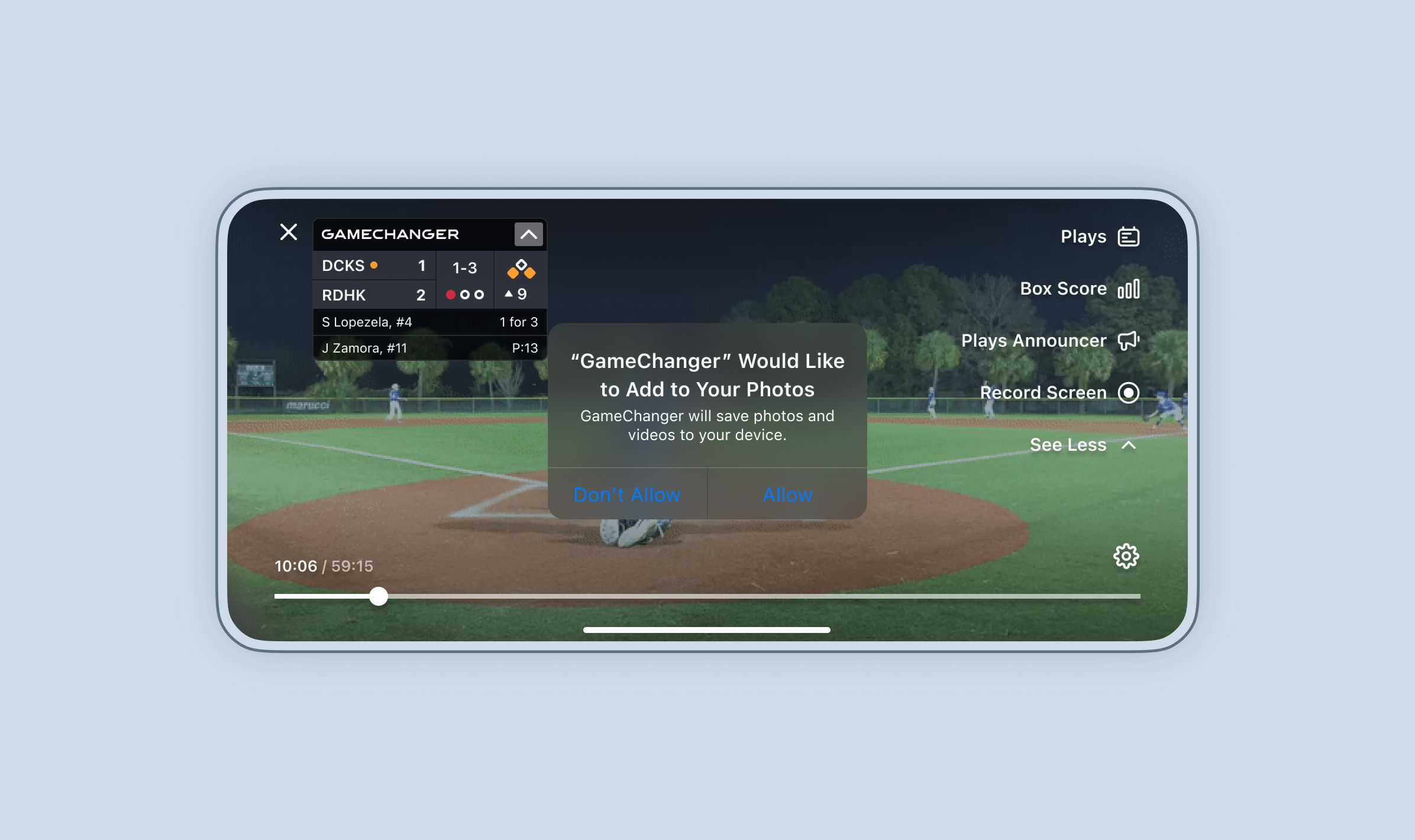 - You may be prompted to allow access to photos. This will allow GameChanger to save your screen recording directly to your photo app. Accept/ turn on access to photos.