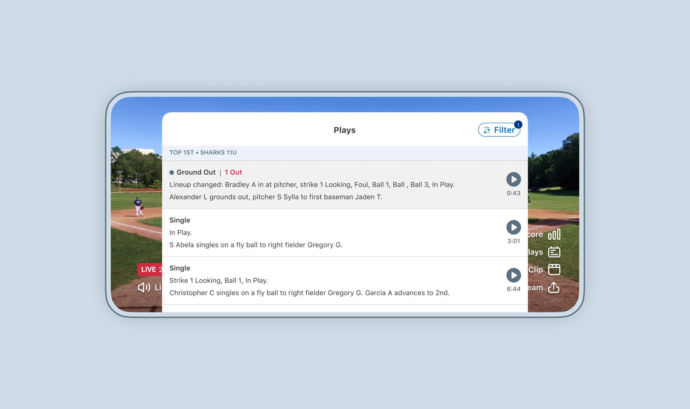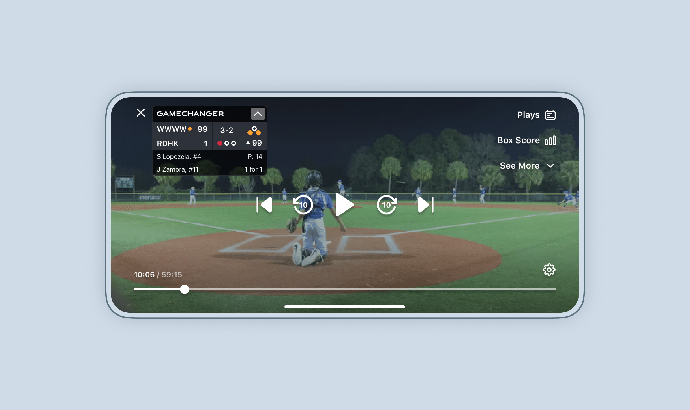 Within your baseball and softball Live Streams and Video Archives, you can now view the: