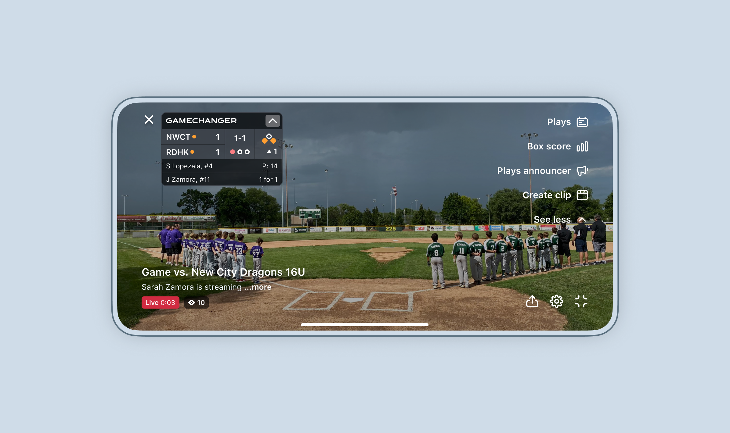 While viewing the Live Stream,Full Event Videos, or Highlight Clips, you can drag and collapse the scoreboard, so no matter what camera angle, the scoreboard won’t block the action!