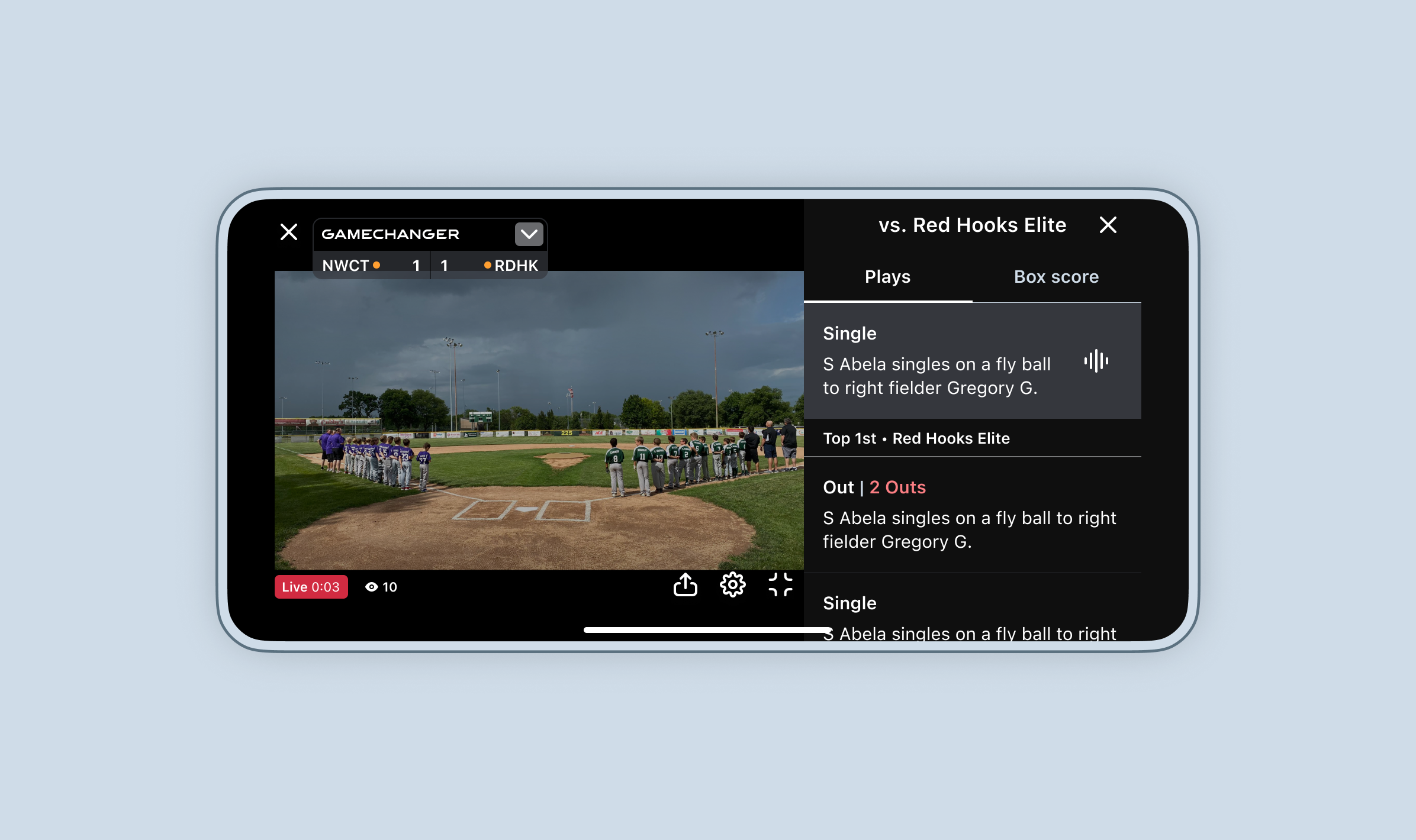 - As the game is streamed and scored, you will see the plays, box score, and scoreboard update in time with the game (Baseball/ softball). For baseball/softball, you will also hear the plays announcer if the toggle is on.