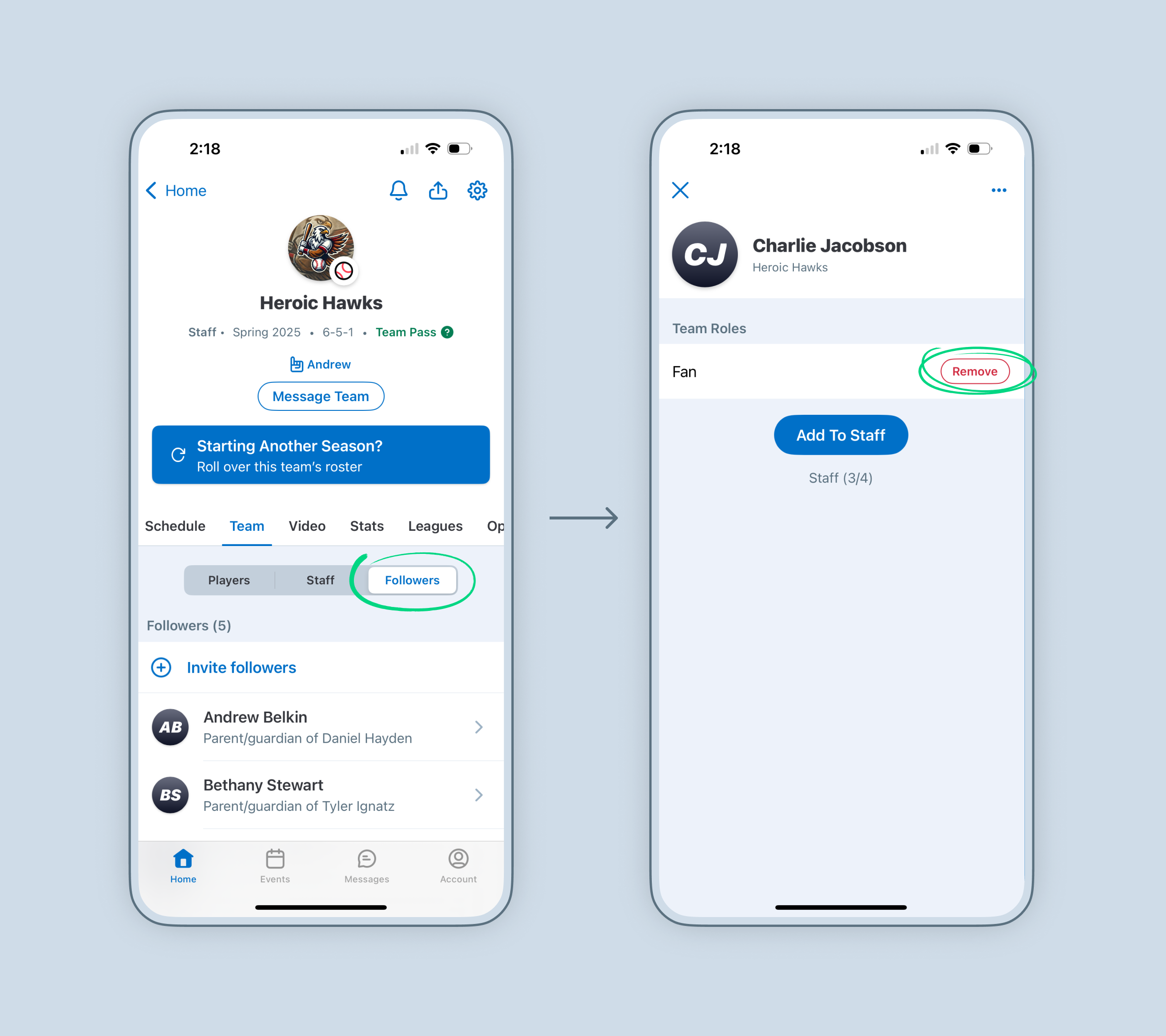 Team Staff members have the ability to both add and remove team roles at any time. In addition to managing staff access, they can remove both family members and general fans from their team community if needed. If a situation arises that necessitates this type of action, please follow the directions below.